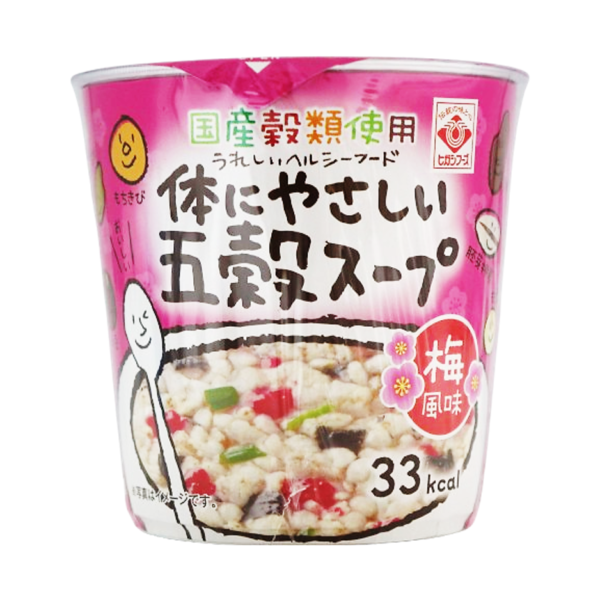 5つの穀類(玄米・黒米、胚芽押麦、もち粟、もちきび、小豆)を、梅と鰹がベースの梅風味スープと一緒にお召し上がりください。