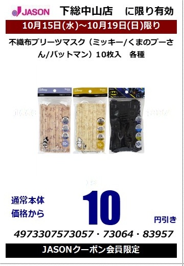 対象商品 ・不織布プリーツマスク ミッキーマウス 10枚 ・不織布プリーツマスク くまのプーさん 10枚 ・不織布プリーツマスク バットマン 10枚