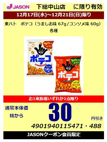 / 東ハト ポテコ(うましお味 67g/コンソメ味 60g) 各種お1家族様いずれか1点限りクーポン使用で本体価格から30円引