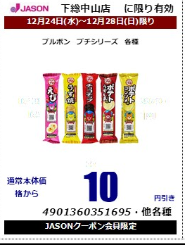 対象商品 ・プチえび 33G ・プチうす焼 30G ・プチチョコチップ 47G ・プチポテトうすしお味 35G ・プチポテトコンソメ味 35G