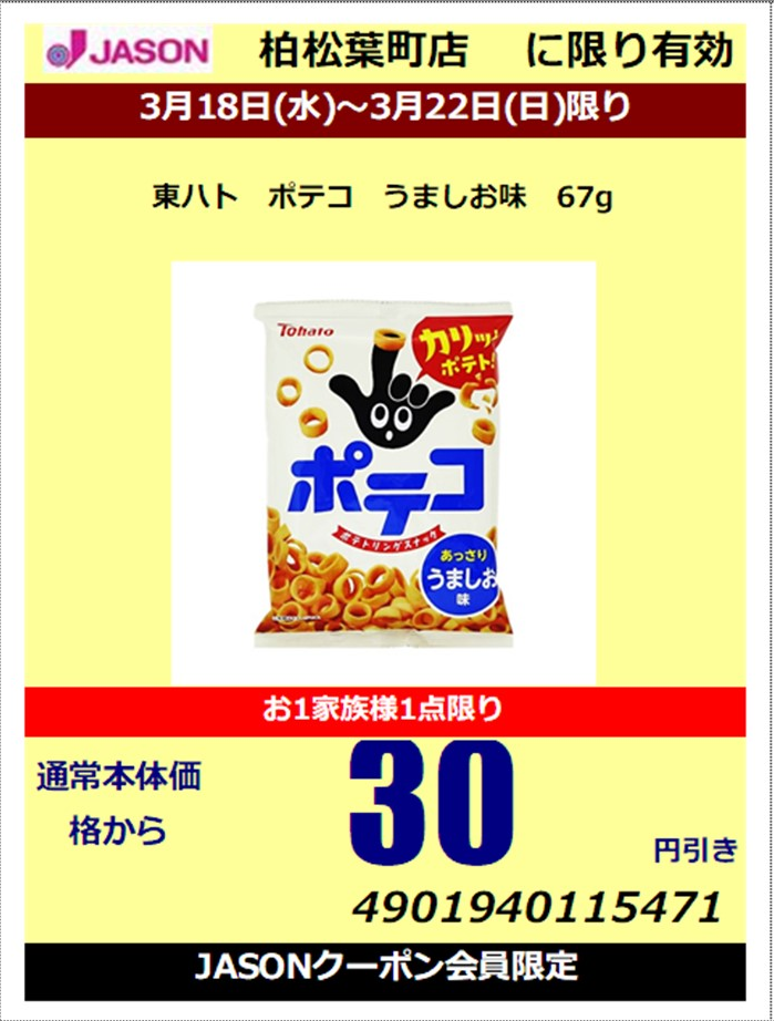 / 東ハト ポテコ うましお味 67gお1家族様1点限りクーポン使用で本体価格から30円引