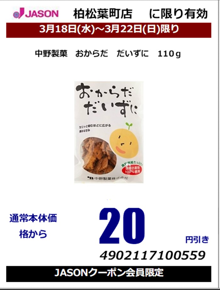 / 中野製菓 おからだ だいずに 110gクーポン使用で本体価格から20円引