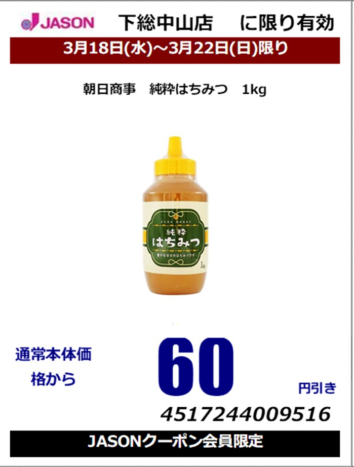 / 朝日商事 純粋はちみつ 1kgクーポン使用で本体価格から60円引