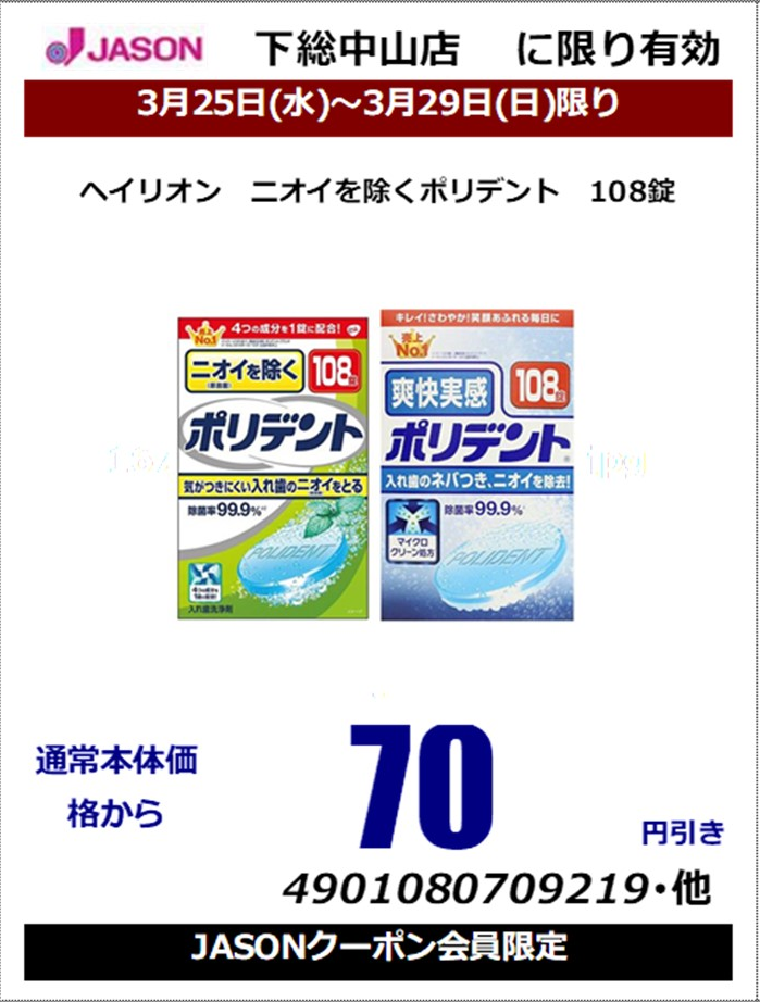 / ヘイリオン ニオイを除くポリデント 108錠クーポン使用で本体価格から70円引